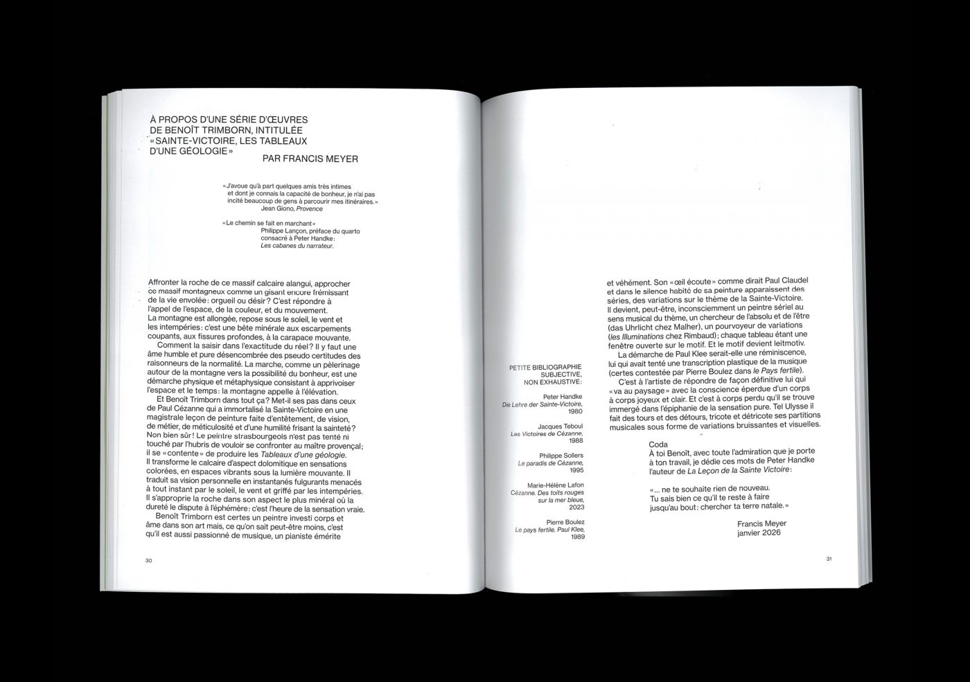 Création et conception du livre d’artiste du peintre Benoît Trimborn : Sainte Victoire, les tableaux d’une géologie, avec des textes de Francis Meyer et Marcel Devime. Couverture embossée, ouvrage imprimé sur papier Artic Volume en tirage limité.